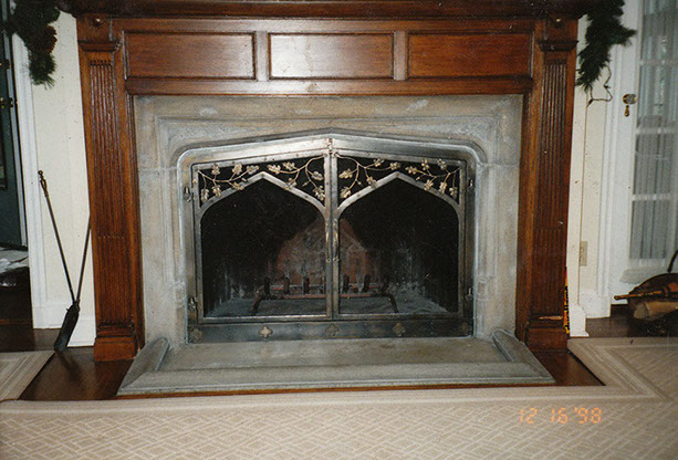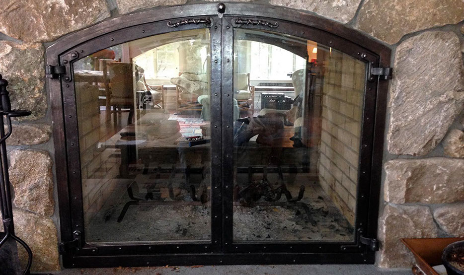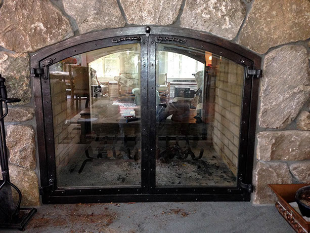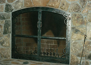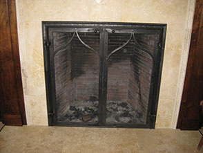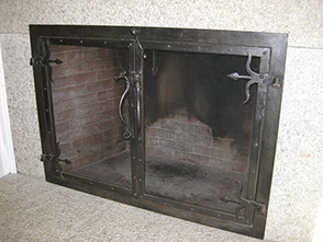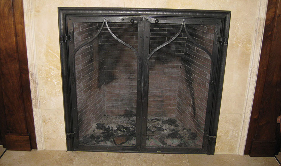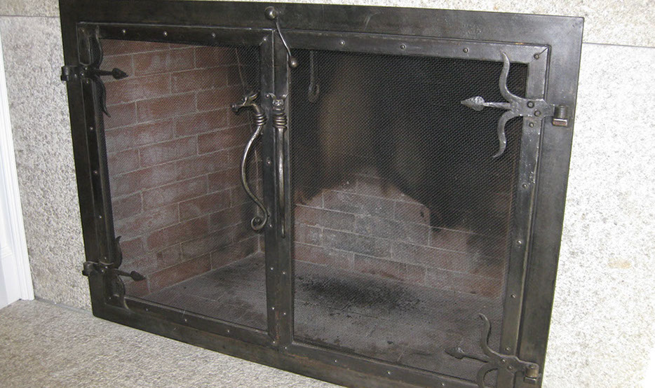 My fire screens are custom made to fit your fireplace. First, a heavy duty outer frame is made to fit the profile of the fire place. Then doors are crafted to fit the frame, eliminating any gaps to make it spark proof. The doors are fitted with a simple latch to keep young children safe away from the fire. The advantages over free standing screens are many; for instance not having to move a heavy hot screen, no more burns from ash on your carpet and it’s just a door to open that pets or a toddler can not push over.