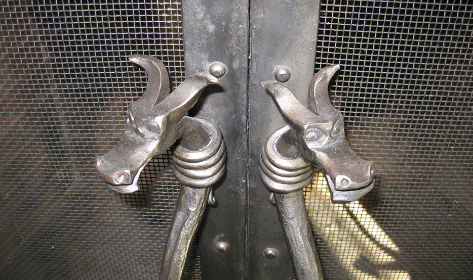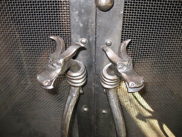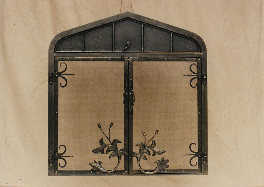Simple screens all have handles and hinges. Sometimes I can incorporate the design into these parts, making form and function work well together. On more elaborate screens I can incorporate side panels or put molding around the frame; different texture from hand hammered, to a clean and smooth finish and all kind in between. A mixture of iron and copper sometimes go well together; a brass or copper rivet creates a contrast with the black mesh.
